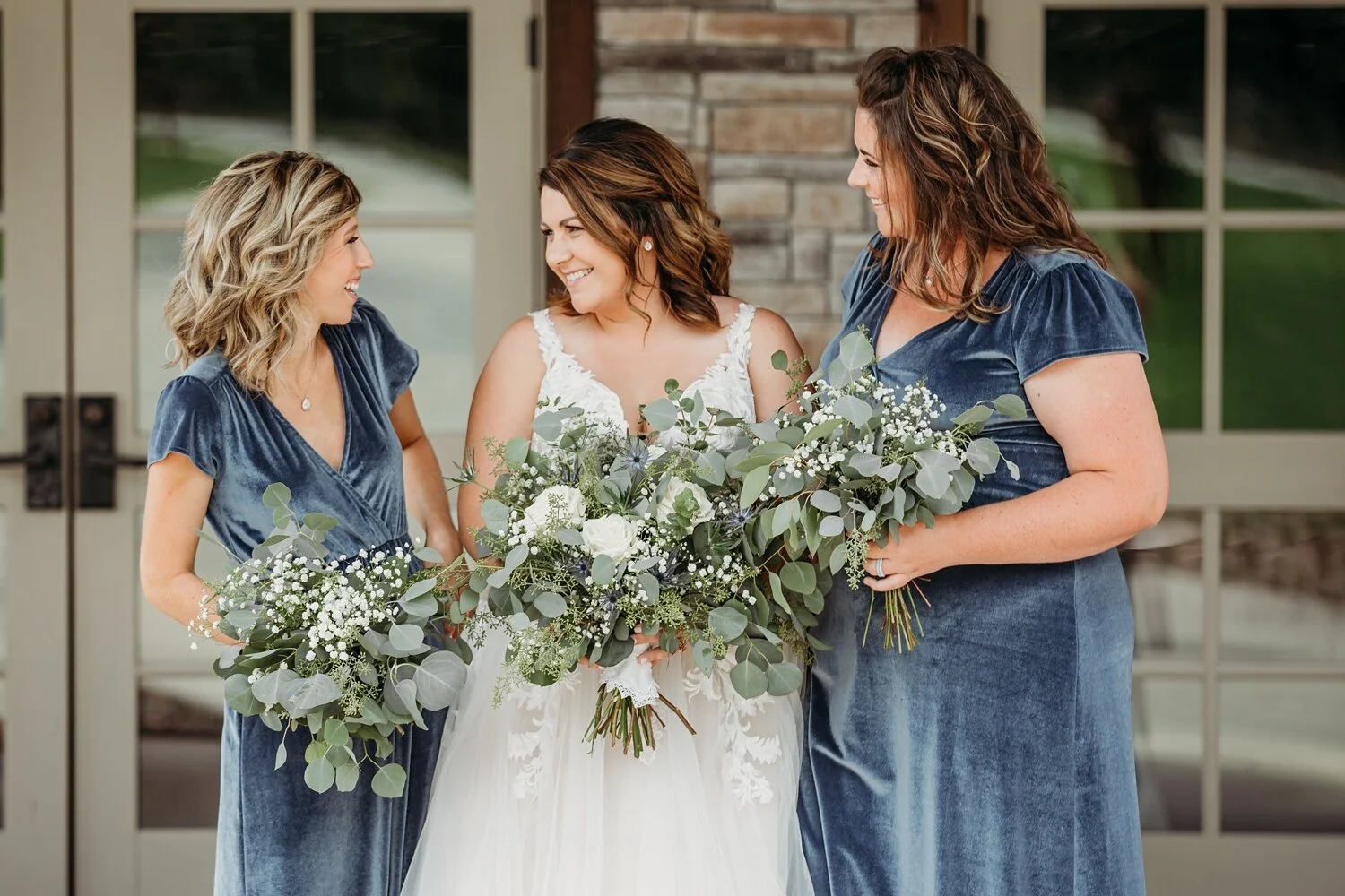 Their wedding day was a warm, bright, and sunny August afternoon. Both the wedding and the reception were held at the beautiful and rustic Loft at Keith Farms wedding venue in Ash Grove, MO. The bridesmaids wore dusty blue velvet dresses, and Madison’s bouquet was mostly white roses with baby’s breath and eucalyptus throughout.
